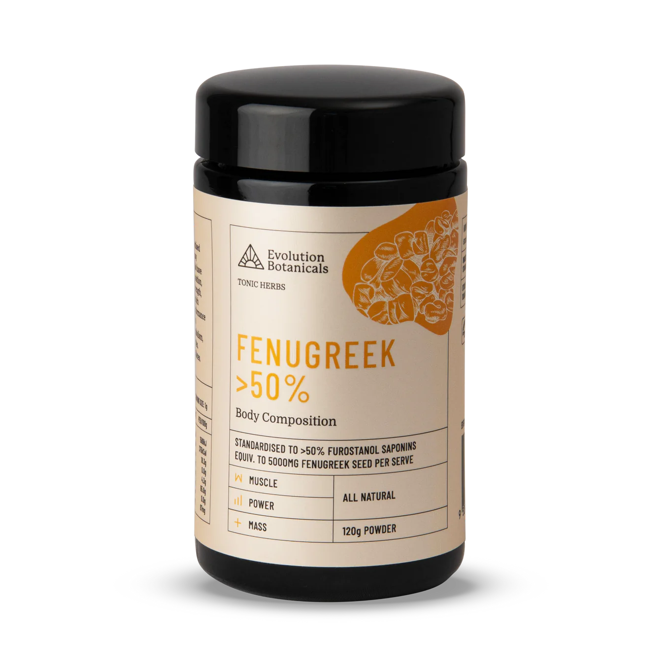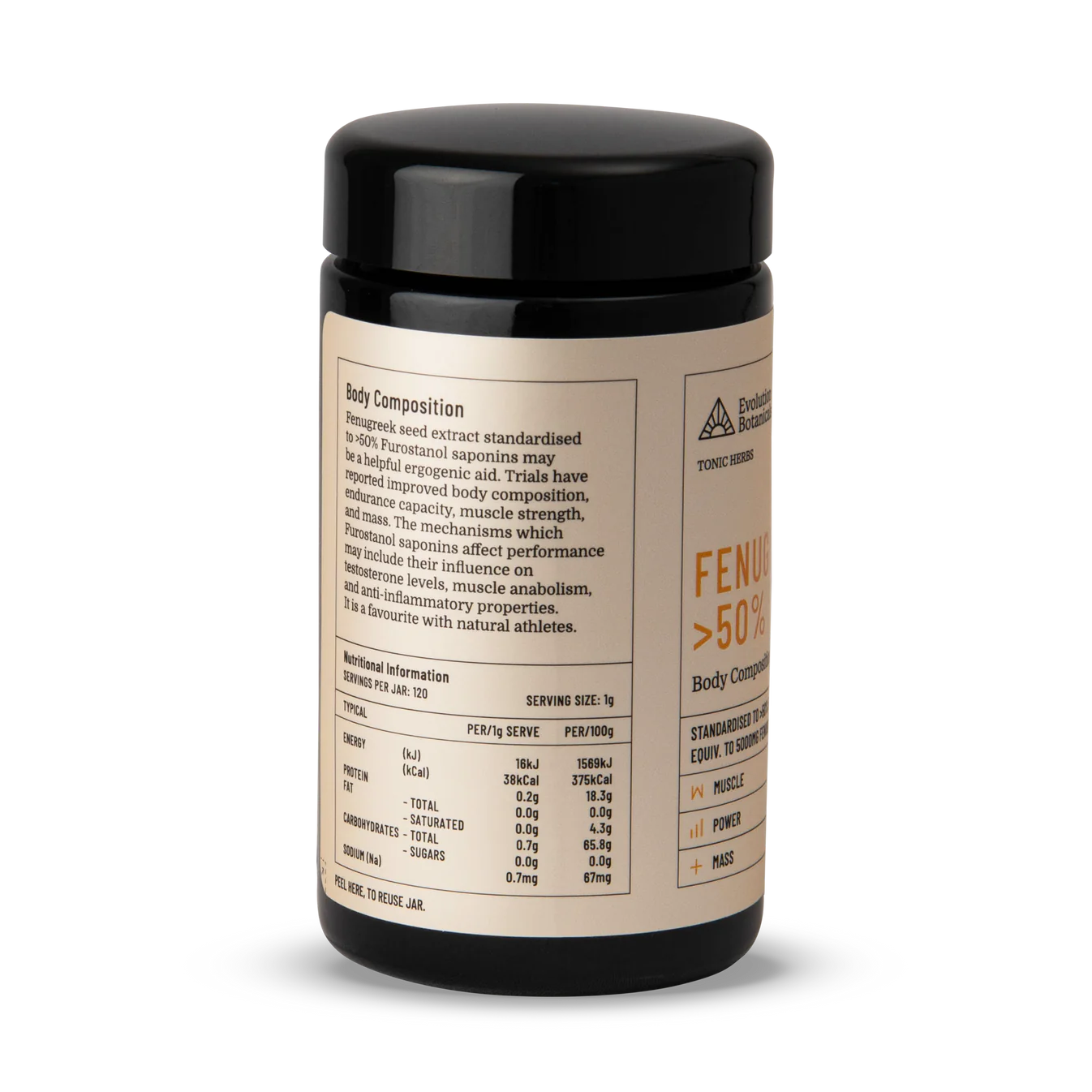 Evolution Botanicals Fenugreek Seed Extract Powder is standardised to contain over 50% Furostanol saponins, a compound known for its potential as an ergogenic aid.